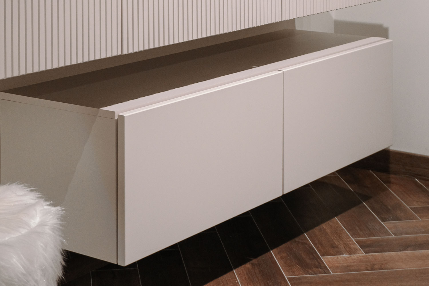- Ящики с направляющими Quadro Hettich со встроенным механизмом и открыванием ящика нажатием на фасад — Push to open. Для срабатывания механизма между корпусом тумбы и фасадом предусмотрен зазор не менее 4 мм.